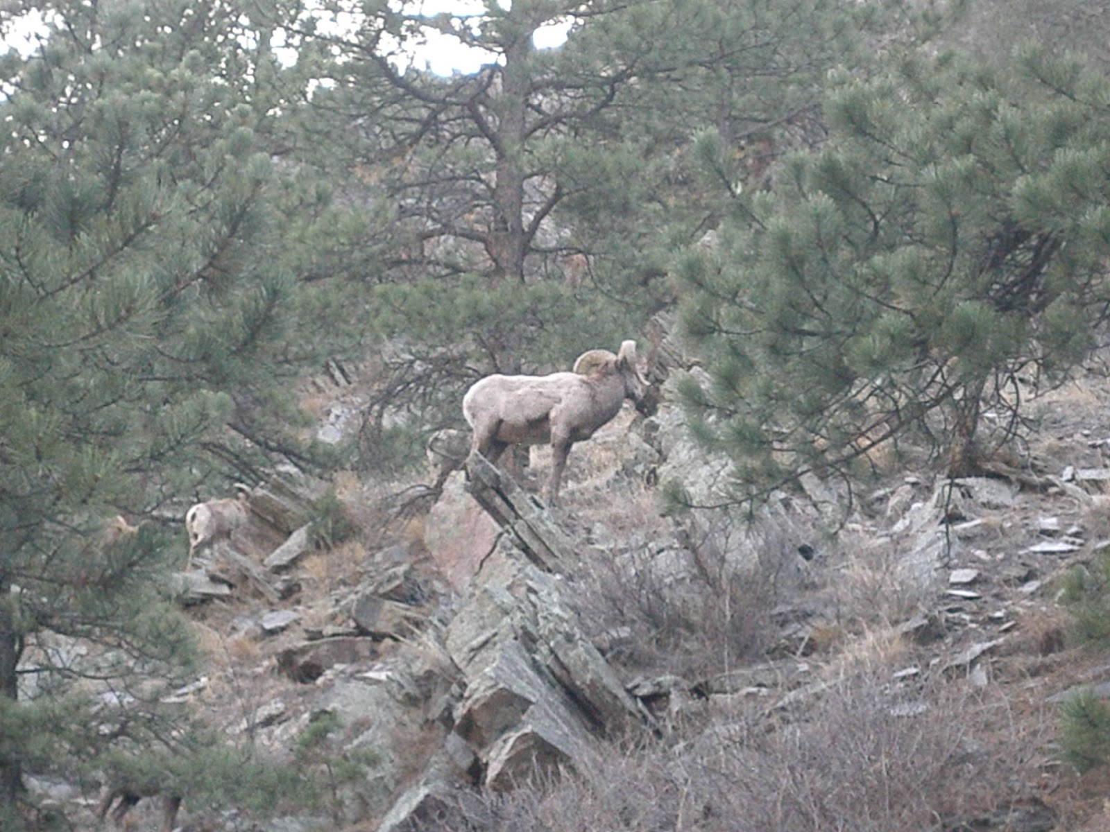 She was right. A small herd of Bighorn Sheep were grazing their way up the steep incline, away from the road. SB got out her camera and we joined the two people on the overlook who were trying to get pictures of these animals, so reclusive when compared to the sheep and elk of Estes. One woman was actually over on their side of the road, trying to hold her camera up high enough to get a shot over the rise and through the trees, but I couldn’t tell you how much luck she was having. The herd moved a little higher up the slope… when suddenly some idiot ran across the road and started climbing. This moron was trying to get high enough on the slope to get a shot of the animals without the intervening trees, completely ignoring the fact that he was climbing up in full view of the herd, that these were wild animals without even the slight domestication of the Estes Park wildlife, and he was going up where they had a definite advantage of mobility.